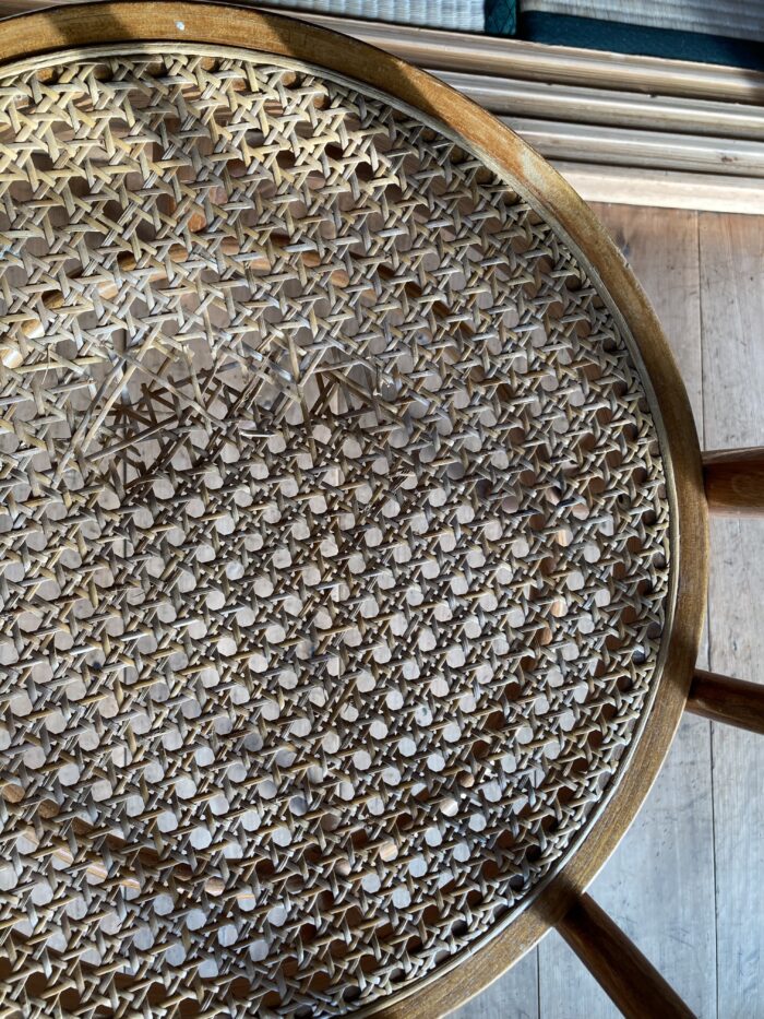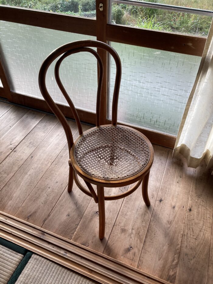 古い藤の椅子。くたびれた椅子。