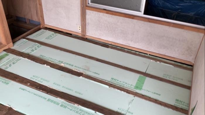 スタイロをちょうどいい大きさに、カッターナイフ等で切ってはめ込んでいきます。発泡スチロールのようなものなので、わりと簡単に切れます。この時に、根太の隙間よりも小さく切ってしまうと、スタイロがスコスコで抜け落ちやすくなってしまいますので、ピッタリか、少し大きめに切って、きゅっと押し込んで入れるくらいがちょうどよいでしょう。