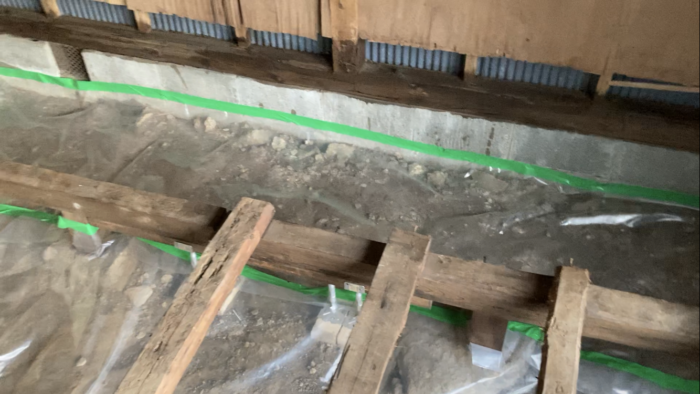 現代の家は、柱、壁、扉、屋根、床だけでなく、多くのシステムが組み込まれ、様々な外傷から守ることが考えられています。「防湿」もその一つで、一般的に床下の防湿には「防湿シート」とよばれるものを使います。防湿シートは、土間のコンクリートの下に敷くものや、外壁の内側に貼るものなど様々ですが、今回は、既存の家の修復になるため、床下の土みに敷き詰める形にしました。気休め程度かなとは思ったのですが、意外と、敷き詰めるだけでも湿度は防いでくれていると実感しています。