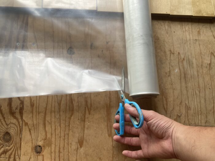 シートは、購入時はロール型で長いものなので、良いサイズに切って床下スペースに敷いていきます。この時に、シートとシートのつなぎ目は、最低でも10cmは重ねて敷くようにしましょう。