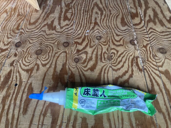 板の裏側に、線で波を描くように、おおざっぱに全体にぬっていきます。この時に注意点ですが、板を実際に貼ったときに、ボンドがはみ出ないように注意して塗りましょう。床板用のボンドは取れにくく、はみ出してしまうと後々かなり厄介なことになります。ボンドは、床板用のものなら、どんなものでも結構だと思います。